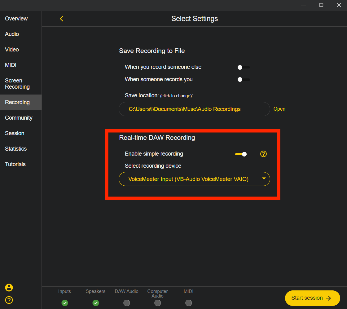When simple recording is enabled, recorded audio from Muse will pass through the selected recording device which you can select as an input in your DAW. There is no additional setup but there will be a delay in the recording.
